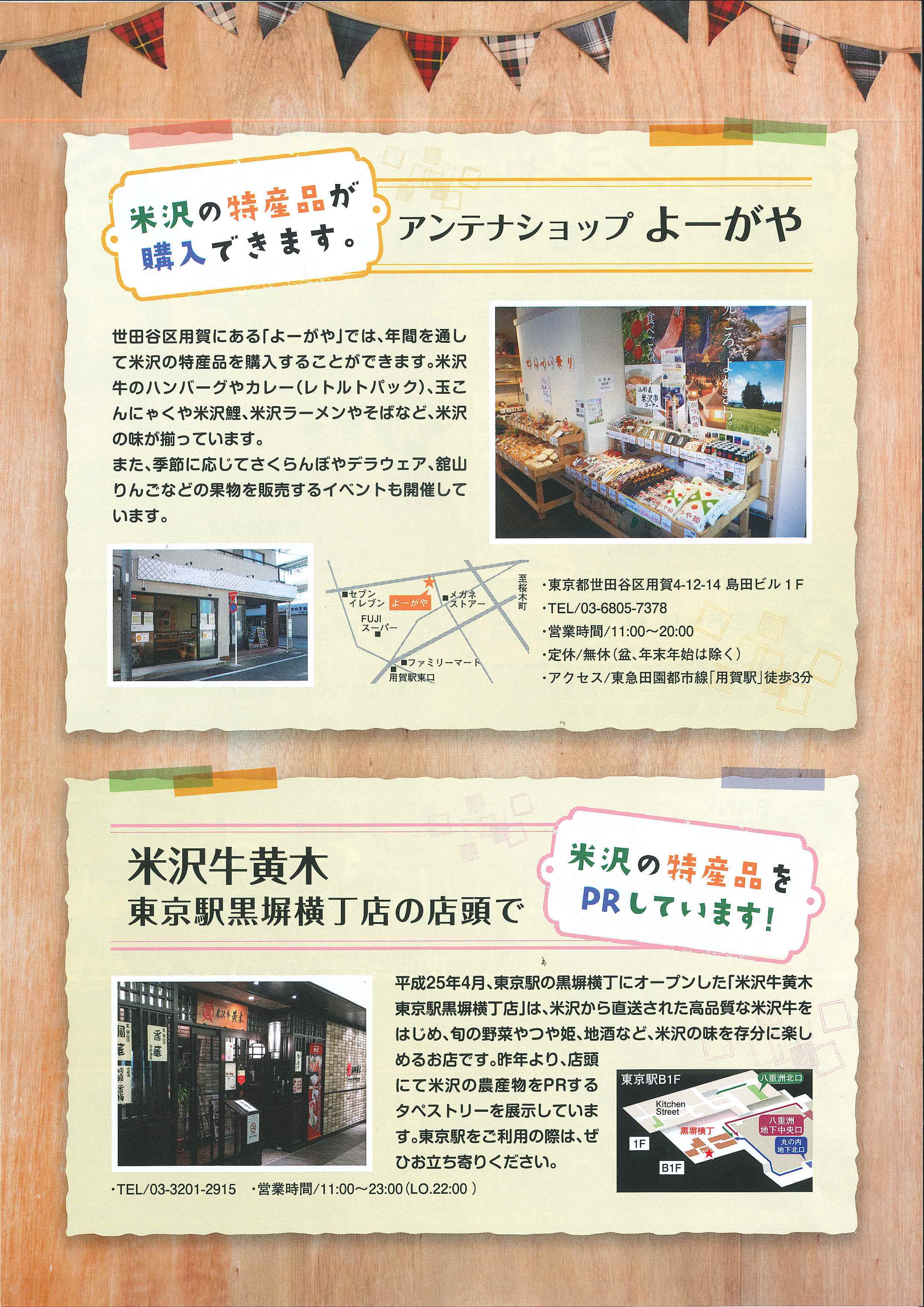 アンテナショップよーがや 東京都世田谷区用賀商店街 米沢の商品を購入できます。 米沢牛黄木 東京駅黒塀横丁 米沢牛をはじめ米沢の味を存分に楽しめます。