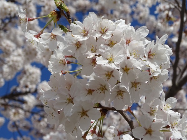 「伝国の杜」駐車場横付近の桜 日が当たる場所は満開です。