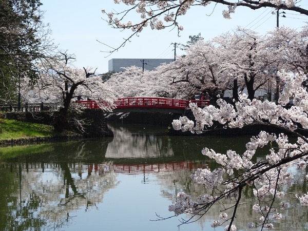 お堀に架かる赤い橋(菱門橋)と満開の桜