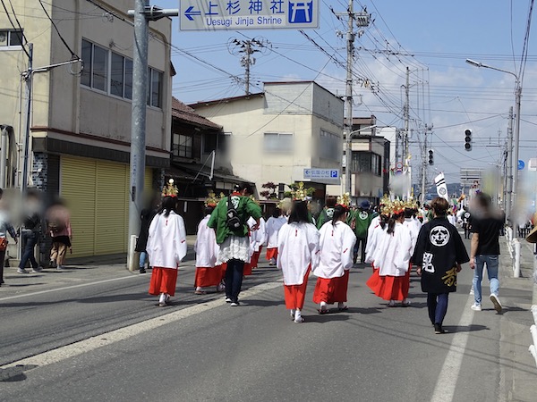 松川河川敷で「川中島の合戦」の前に街中を行列