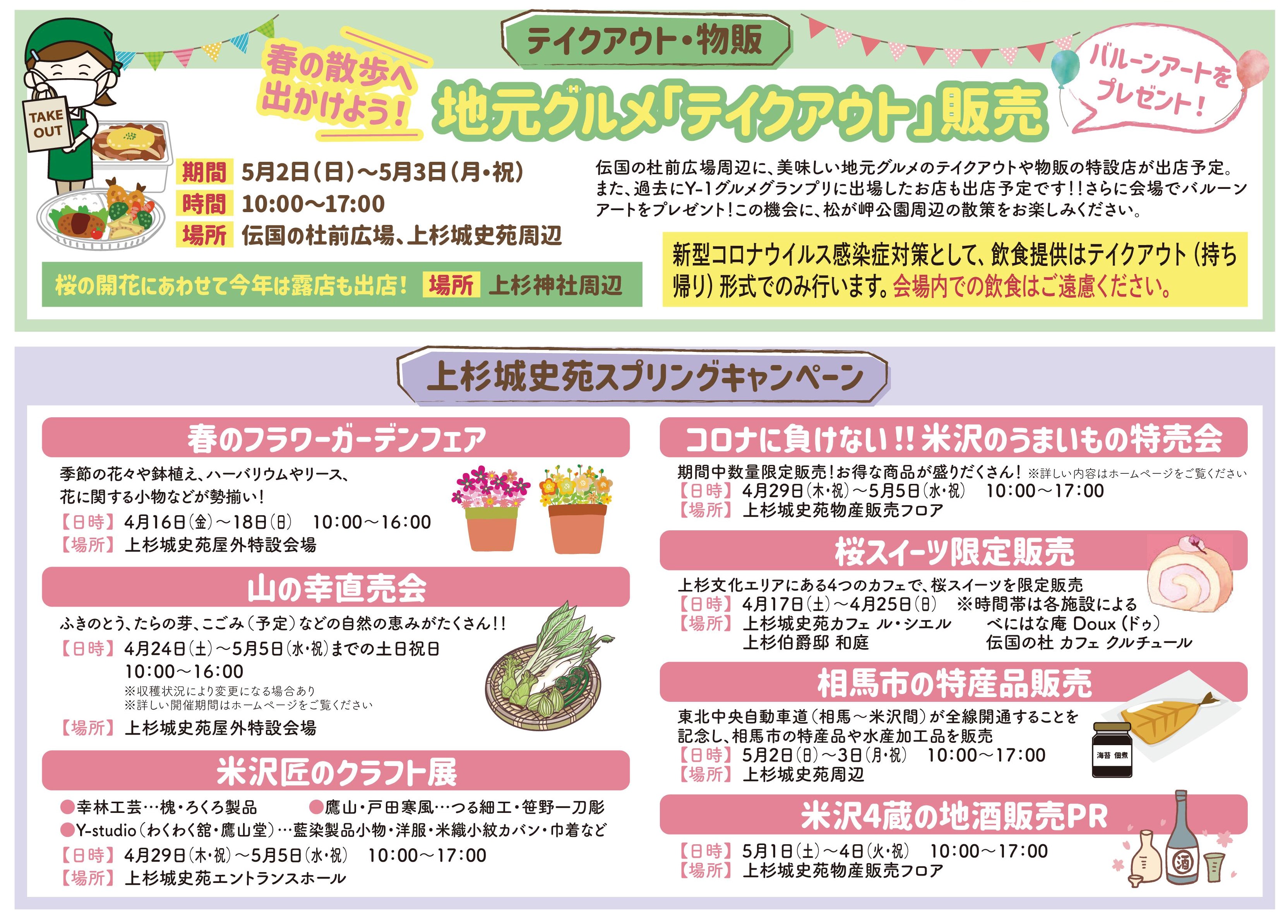 地元グルメのテイクアウト販売 期間 5月2日・3日 時間 10時〜17時 場所 伝国の杜前広場 出店者 DaisyCafé ジャックスブルワリー&PIZZA Ktarou ゆあーず カレー屋GARBANZO Café towa コンフォルタ そばや伝右ヱ門 秋葉糀味噌醸造 タスクフーズ 上杉城史苑スプリングキャンペーン 毎週様々なイベントを開催! 相馬物産展では相馬の美味しい海産物の販売!