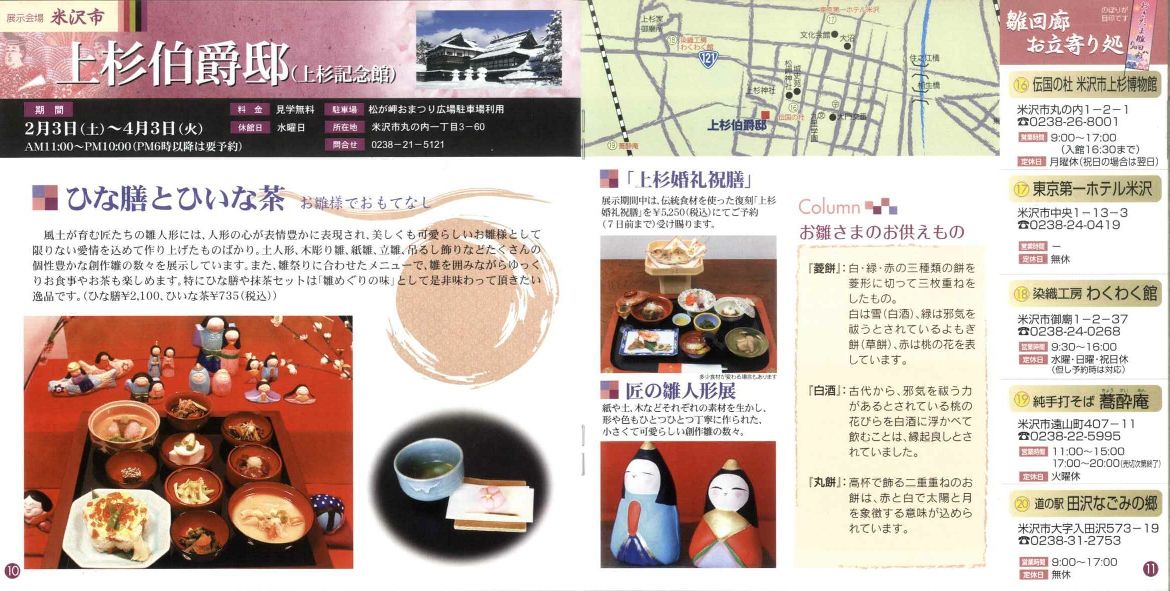 匠の雛人形展 ひな膳とひいな茶 期間 2月3日(土)〜4月3日(火) 時間 11:00〜22:00(18:00以降は要予約) 料金 見学無料 休館日 水曜日 住所 米沢市丸の内1−3−60 問合せ 0238−21−5121 駐車場 松が岬おまつり広場駐車場をご利用ください 建物が国の登録文化財になっております。 そのほか上杉婚礼膳の提供など