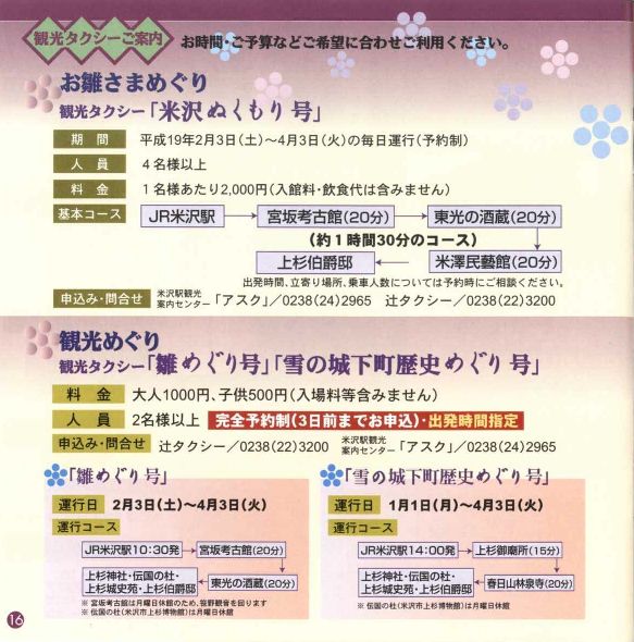 お雛さまめぐりコース 観光タクシー「米沢ぬくもり号」 観光めぐりコース 観光タクシー「雛めぐり号」「雪の城下町歴史めぐり号」