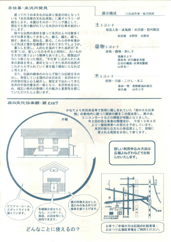 展示構成 土を活かす 相良人形・成島焼・米沢焼・現代陶芸 相良隆 水野哲 水野宗 植物を活かす 染物・織物・刺し子 遠藤きよ子 原始布古代織参考館、出羽の織座、米澤民藝館 山岸幸一 木を活かす 笹野一刀彫・こけし・木工 栗林一雪 笹野彫協同組合 林久雄 山中三平