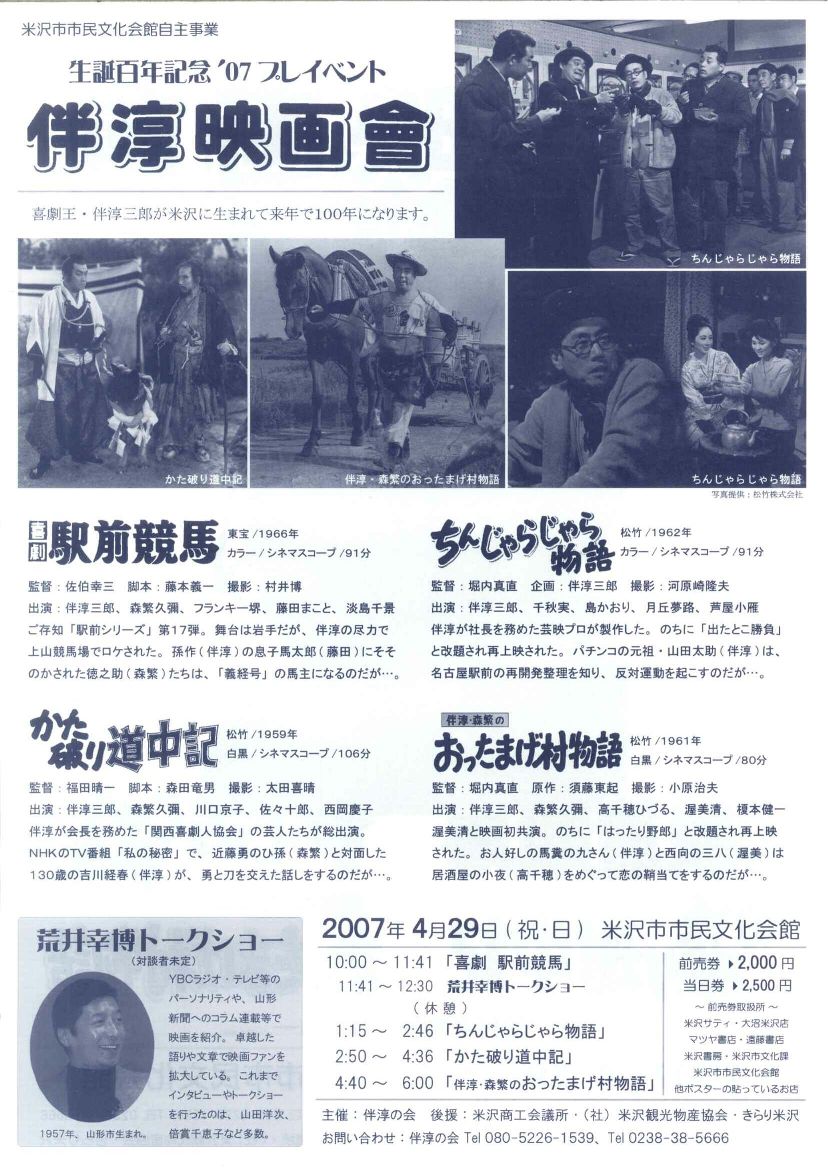 米沢上杉まつり協賛事業 生誕百年07プレイベント 伴淳映画會 ・喜劇駅前競馬 ・ちんじゃらじゃら物語 ・かた破り道中記 ・おったまげ村物語 荒井幸博氏トークショー (対談者未定)
