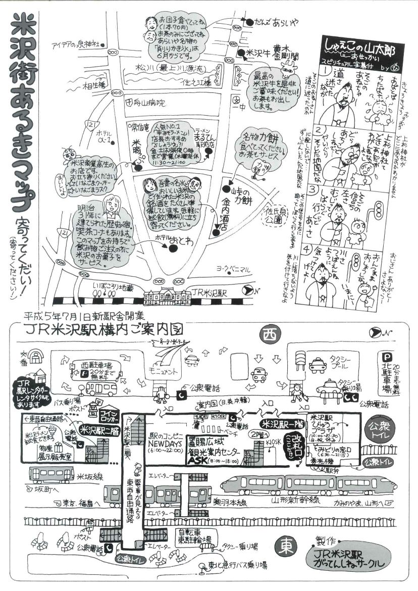 駅の案内図や米沢弁の方言4コママンガも楽しいです。 このマップを持っていくと受けられるお得なサービス情報も載ってます。