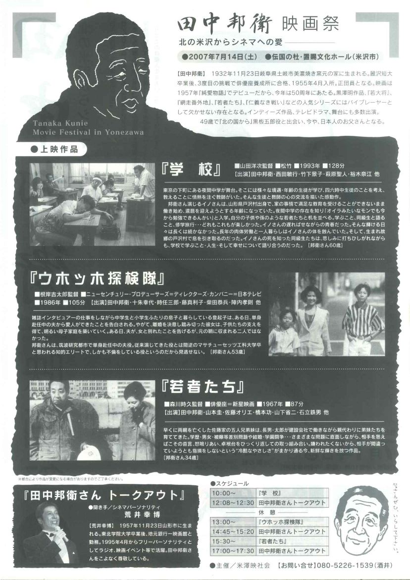 上映作品 ・「学校」 ・「ウホッホ探検隊」 ・「若者たち」 スケジュール 10:00〜 「学校」 12:08〜12:30 田中邦衛さんトークアウト 休憩 13:00〜 「ウホッホ探検隊」 14:45〜15:20 田中邦衛さんトークアウト 15:30〜 「若者たち」 17:00〜17:30 田中邦衛さんトークアウト