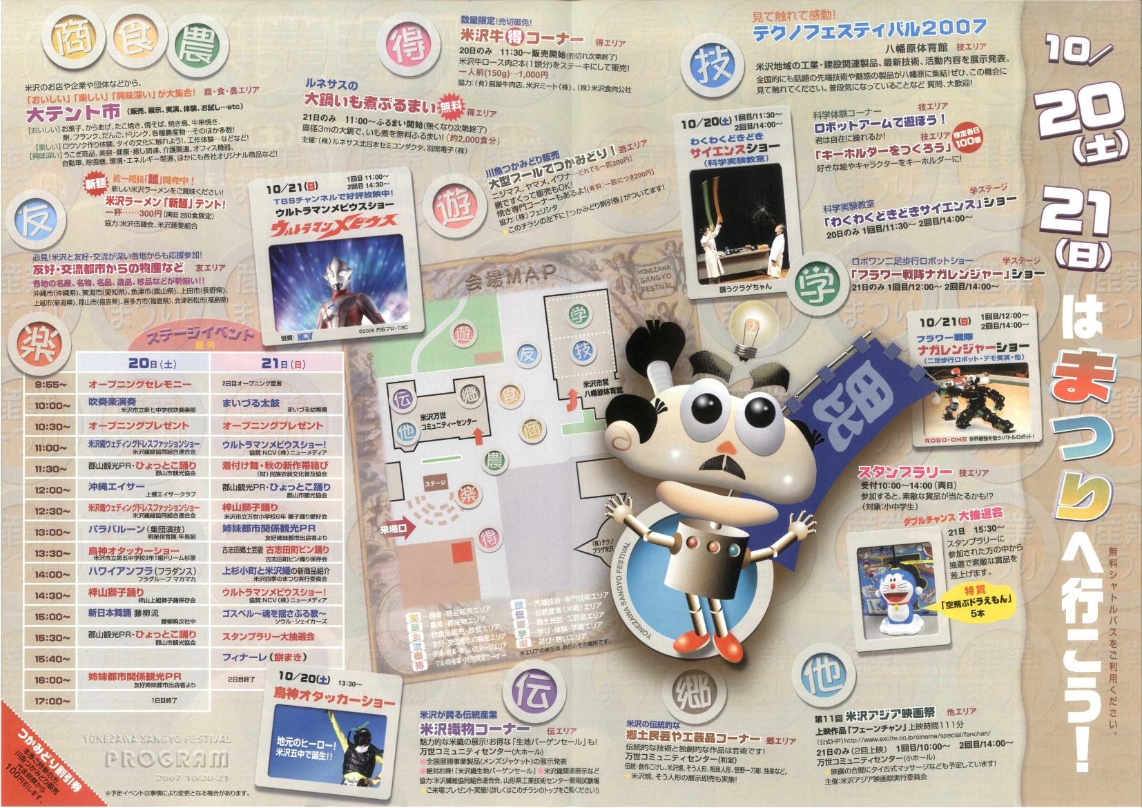 ◇大テント市 やきとり、カキ氷、牛串焼き からあげ、焼きそば、たこ焼き 玉こんにゃく、クッキーなど 美味しいものがたくさん! ◇米沢ラーメン「新麺」 ◇大鍋芋煮ぶるまい 無料 ◇米沢牛得コーナー ◇友好、交流都市物産 ◇川魚つかみどり販売 ◇米沢市テクノフェスティバル2007(企業製品展示) 八幡原体育館 20日(土)のイベント 屋外ステージ 10:00〜 米沢7中吹奏楽部演奏会 12:00〜 上郷エイサークラブ 13:30〜 地元のヒーロー誕生! 米沢5中「鳥神オタッカー」ショー 屋内ステージ きみにはわかるかな? 「サイエンスショー」 1回目 11:30〜 2回目 14:00〜 米沢牛得イベント 20日のみ 11:30〜 川魚つかみどり 焼きコーナー 1匹200円 スタンプラリー 両日とも10名様に抽選で素敵な商品プレゼント 芋煮ぶるまい 21日のみ 11:00頃 21日(日)のイベント 屋外ステージ ウルトラマンメビウスショー 1回目 11:00〜 2回目 14:30〜 12:30〜 万世小獅子踊り愛好会 屋内ステージ ロボット同士の激突! フラワー戦隊 ナガレンジャーショー 1回目 12:00〜 2回目 14:00〜