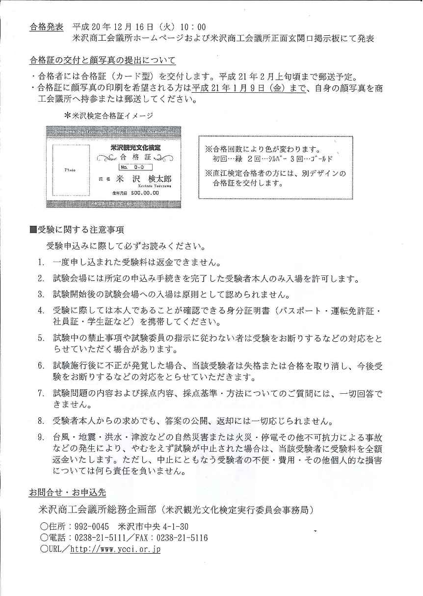 合格発表 平成20 年12 月16 日(火)10:00 米沢商工会議所ホームページおよび 米沢商工会議所正面玄関口掲示板にて発表 合格証の交付と顔写真の提出について ・合格者には合格証(カード型)を交付します。 平成21 年2 月上旬頃まで郵送予定。 ・合格証に顔写真の印刷を希望される方は 平成21 年1 月9 日(金)まで、自身の顔写真を 商工会議所へ持参または郵送してください。 ■受験に関する注意事項 受験申込みに際して必ずお読みください。 1. 一度申し込まれた受験料は返金できません。 2. 試験会場には所定の申込み手続きを完了した 受験者本人のみ入場を許可します。 3. 試験開始後の試験会場への入場は原則として 認められません。 4. 受験に際しては本人であることが確認できる身分証明書 (パスポート・運転免許証・社員証・学生証など) を携帯してください。 5. 試験中の禁止事項や試験委員の指示に従わない者は 受験をお断りするなどの対応をとらせていただく場合があります。 6. 試験施行後に不正が発覚した場合、当該受験者は 失格または合格を取り消し、今後受験をお断りするなどの 対応をとらせていただきます。 7. 試験問題の内容および採点内容、採点基準・方法についての ご質問には、一切回答できません。 8. 受験者本人からの求めでも、答案の公開、返却には 一切応じられません。 9. 台風・地震・洪水・津波などの自然災害または火災・ 停電その他不可抗力による事故などの発生により、 やむをえず試験が中止された場合は、 当該受験者に受験料を全額返金いたします。 ただし、中止にともなう受験者の不便・費用・その他 個人的な損害については何ら責任を負いません。 お問合せ・お申込先 米沢商工会議所総務企画部(米沢観光文化検定実行委員会事務局) ○住所:992-0045 米沢市中央4-1-30 ○電話:0238-21-5111/FAX:0238-21-5116 ○URL/http://www.ycci.or.jp