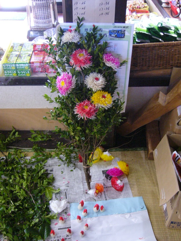 笹野民芸館さんでは そのほか 一刀彫で仕上げた見事な笹野花 和紙をロウで固めて花に見立てた 紙花や、つつじに和紙をつけたつつじ花 が販売されておりました。 笹野花は、コシアブラの木を削って作る造花で、 花のない冬季間に仏壇などに供えられてきたものです。