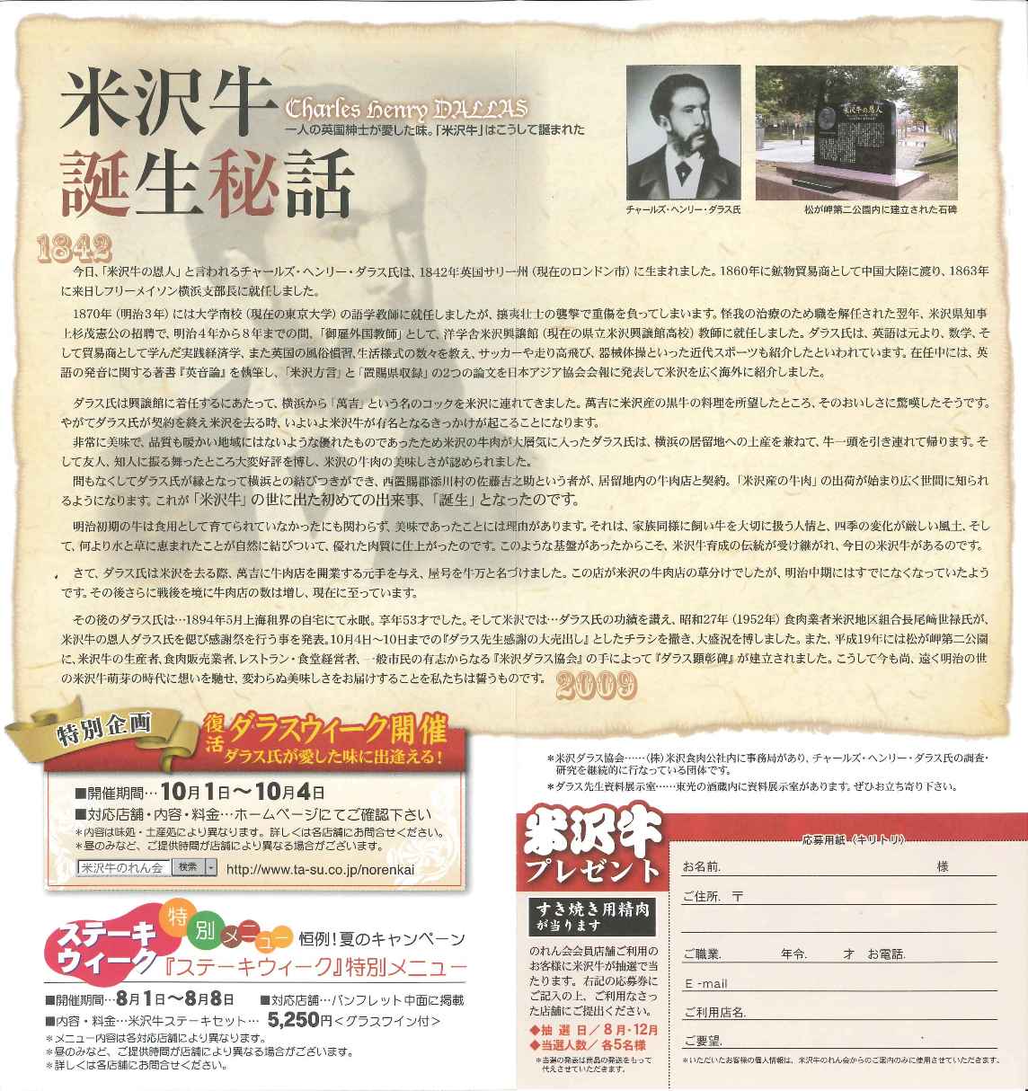 パンフレット裏面 ・米沢牛誕生秘話 ・特別企画 復活ダラスウィーク開催! 10月1日〜10月4日 対応店舗・内容・料金 ホームページにてご確認ください。