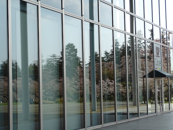 伝国の杜、お堀に面する喫茶室ガラス面に映る桜