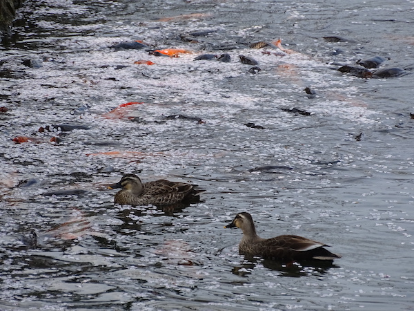 お堀に浮かぶ桜に鴨と鯉