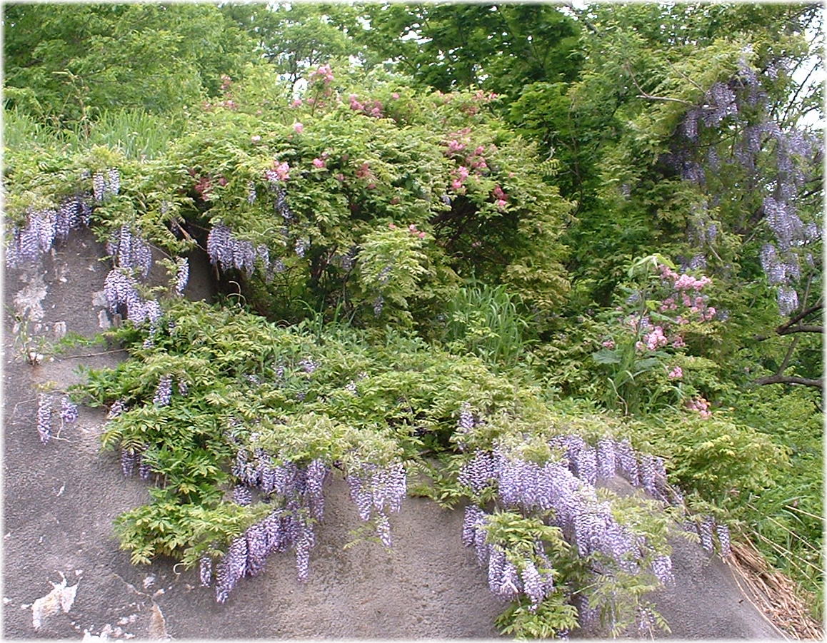 白川ダム道路の岩肌に咲いた藤の花です。 昨年、交通安全のノボリ旗が目印、白滝不動尊のお堂の上に咲いたものです。